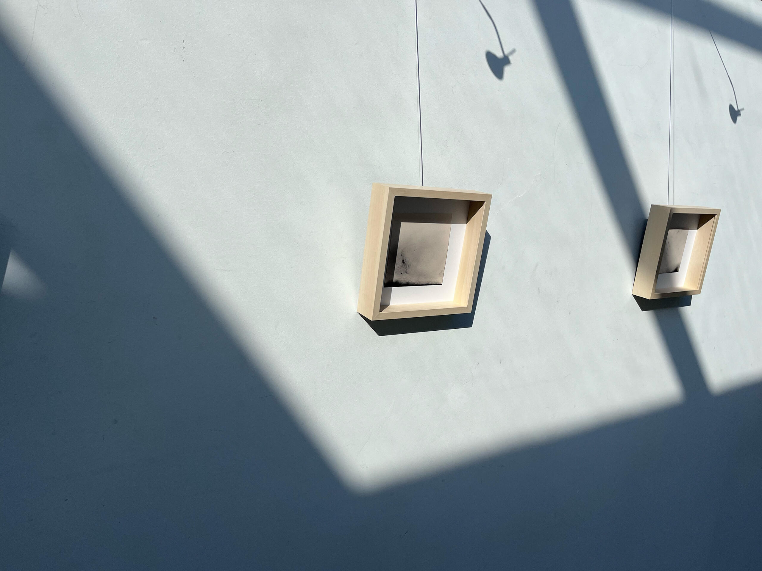 /Site-specific installation. Dry pastel, wire, shadow drawing, text/2024 10 25 – 11 07“Empathy” was the first word that came to mind when I began thinking about the piece for Marija’s exhibition. The only condition was that the work must arise from our interaction. Her words echoed in my mind as I picked up the blue pastel. A few hours later, I found myself unveiling the familiar ache of that feeling — blue and heavy. I reached for nails and a hammer, bent that blue into form, and drove it into the wall of my room.After hanging on my wall for a week, the work was taken to Telšiai, where it was twisted, bent, and reshaped for two full days. I couldn’t find a form that resonated with the space while still preserving the emotion I wanted to embody. “You spent two days trying to tame the sky,” a colleague said — and I realized that was the best possible description of my process.This entire piece is a tribute to emotion. To the kind that sometimes wraps gently around your shoulders, and other times pierces straight through your gut like a cold metal ring. It’s so easy to shut it away, to hide it, to pretend it isn’t there. But for an artist, that isn’t an option. So I lift my tired body from the chair and head out to bend a new sky.Exhibited in: Witching Again..., exhibition curated by Marija Marcelionytė-Paliukė, VAA Telšiai Gallery, Telšiai (Lithuania) 2024.11.07 – 2024.12.07_